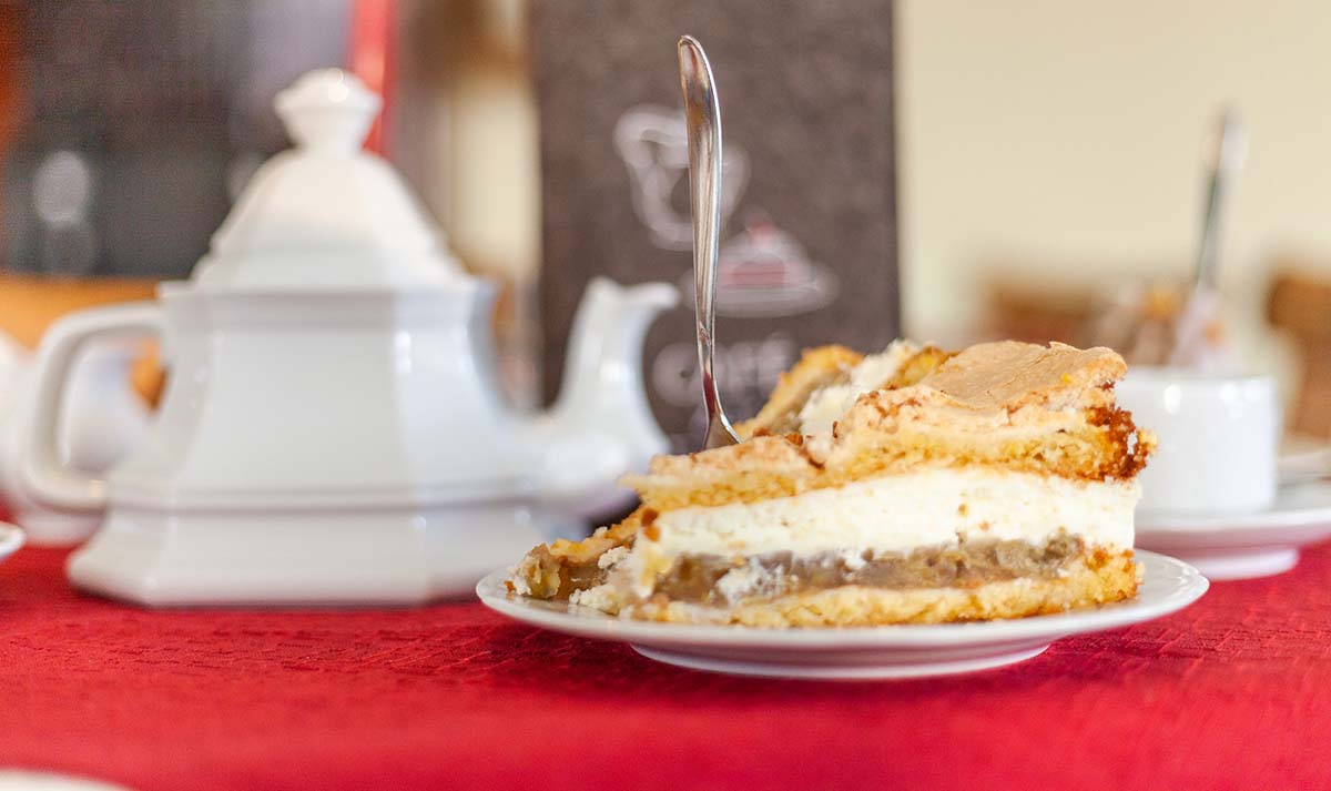 Unser besonderes Angebot sind die frisch zubereiteten Torten und Kuchen, darunter auch Spezialitäten des Hauses. Dazu gibt es Kaffee, Tee, verschiedene Kaffeespezialitäten sowie diverse Kaltgetränke.